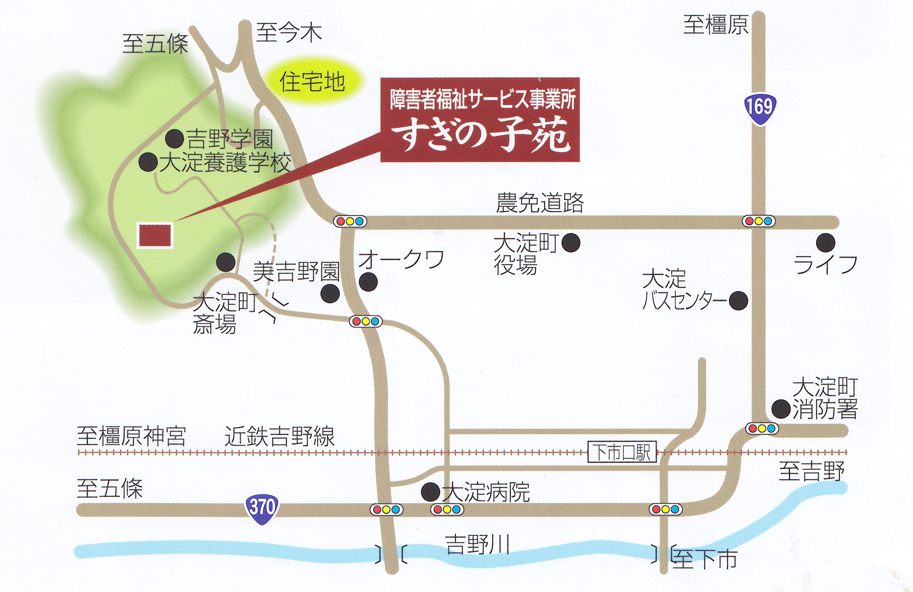 JRをご利用の方は、JR和歌山線吉野口駅で近鉄吉野線吉野行き(急行,準急)に乗り換え下市口駅で下車